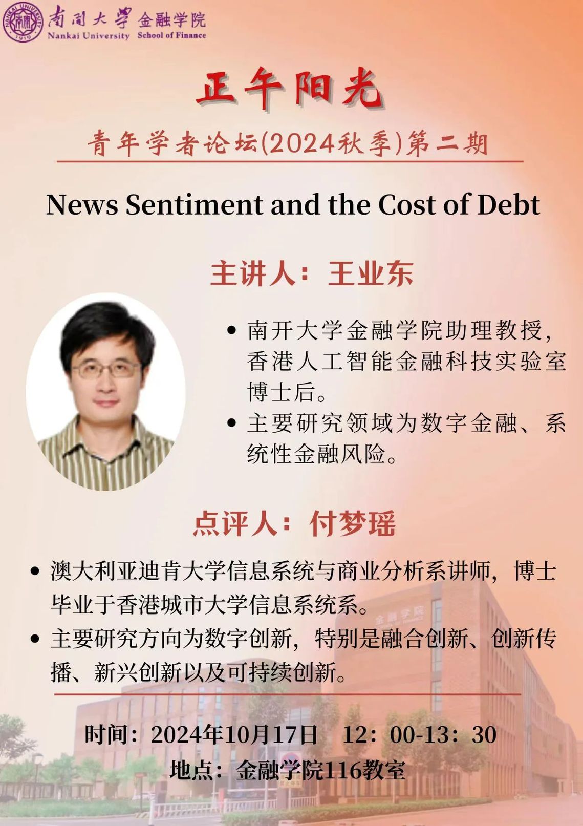“Noon Sunshine-Young Scholars Seminar” is a regular academic exchange platform held by School of Finance. It aims to offer valuable occasions of communications among scholars in our college, between teachers and students, the domestic and the oversea. In this semester, we keep our original intention, set off for a new voyage. We will devote ourselves to fostering the academic atmosphere in the college, and promoting the academic level for both teachers and students.