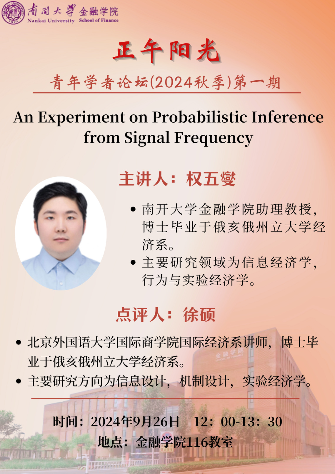 “Noon Sunshine-Young Scholars Seminar” is a regular academic exchange platform held by School of Finance. It aims to offer valuable occasions of communications among scholars in our college, between teachers and students, the domestic and the oversea. In this semester, we keep our original intention, set off for a new voyage. We will devote ourselves to fostering the academic atmosphere in the college, and promoting the academic level for both teachers and students.